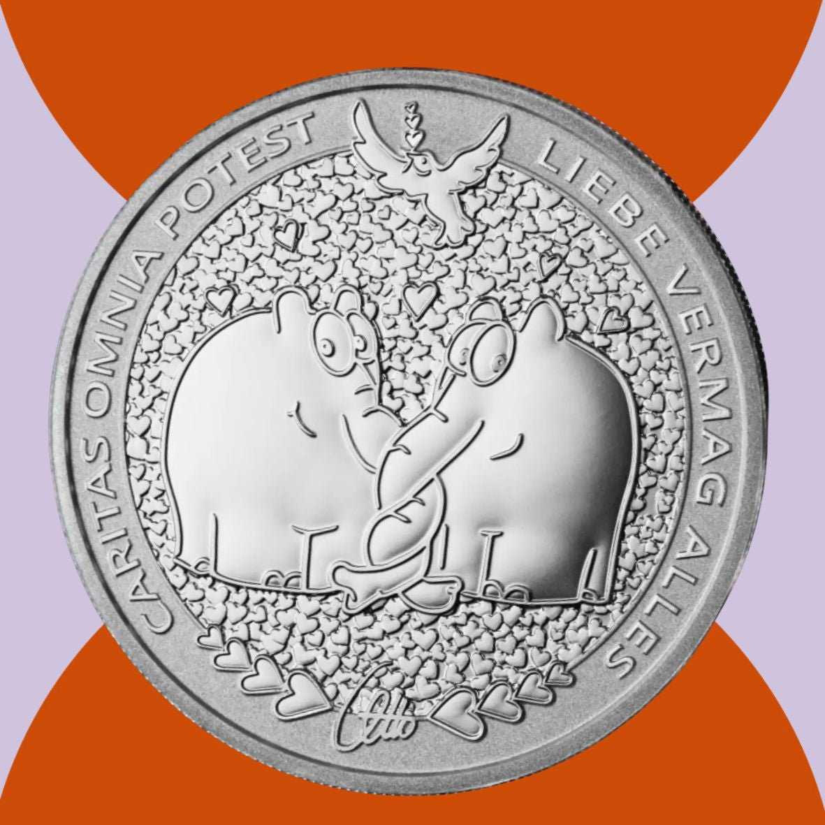 Das Motiv bildet die beiden Ottifanten mit verliebt umschlungenen Rüsseln ab, die in einer Spirale umeinander gekringelt sind. Die lächelnden Geschöpfe stehen rechts und links nebeneinander, wobei sie sich schräg nach vorne zueinander wenden. Der Hintergrund ist hierbei übersäht von willkürlich verteilten Herzen sowie einigen wenigen vordergründig über den Köpfen der kleinen Elefanten. Hinzu kommt eine Taube, die zentral über ihnen an der Spitze des Münzrandes ebenso Herzchen in ihrem Schnabel trägt. Unterhalb findet sich die offizielle Signatur des Schöpfers Otto Waalkes. Entlang des Randes sind links die lateinischen Worte "CARITAS OMNIA POTEST" zu lesen sowie rechts daneben die entsprechende deutsche Übersetzung "LIEBE VERMAG ALLES". Die Kehrseite präsentiert das Konterfei des britischen Königs Charles III, dessen Abbild in einer Seitenansicht nach links blickt. Um ihn herum verlaufen mehrere Beschriftungen, zum einen sein Name sowie das Ausgabeland und der Nennwert. Zum anderen ist noch die Gewichtsangabe samt dem Feingehalt, dem Edelmetall und dem Ausgabejahr zu sehen.