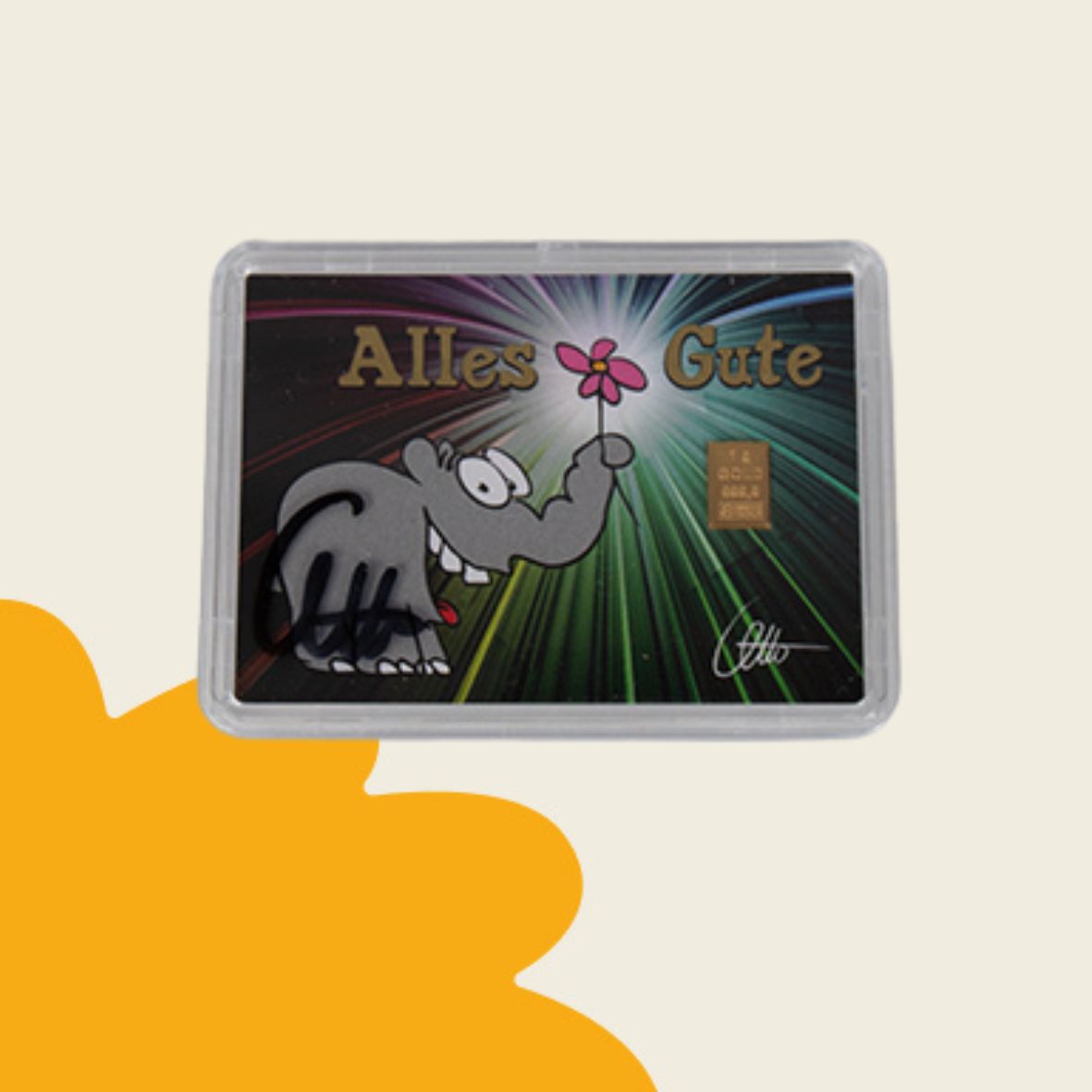 1g Ottifant Goldbarren in "Alles Gute" Motivbox -Schutzkapsel + Original Signatur von Otto Waalkes