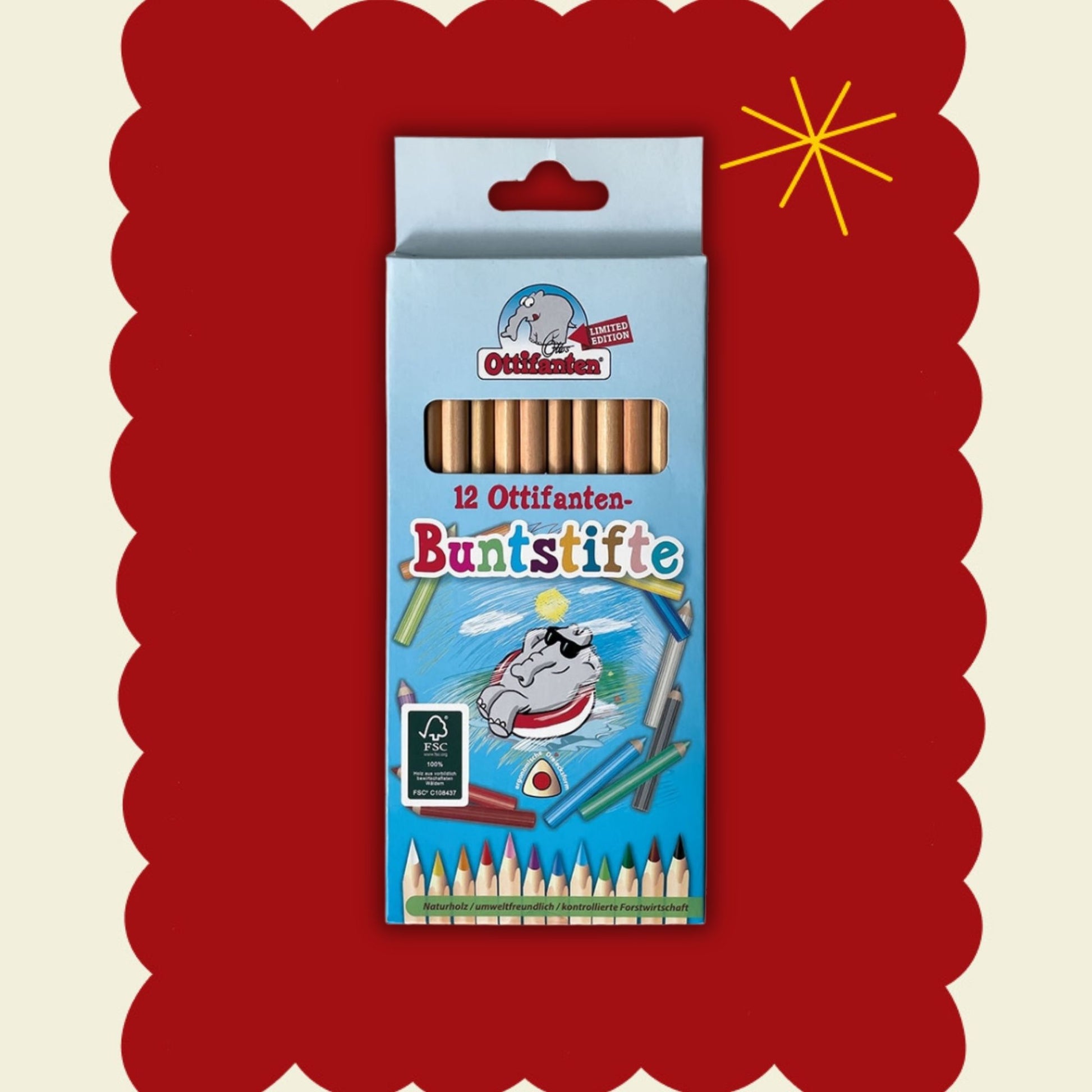 Hier gibt es unsere neuen Ottifant Buntstifte. Denn Ottos Lieblingsfarbe ist BUNT! Und dieses Stifte-Set besteht aus 12 Buntstiften in tollen Farben und natürlich mit einem lustigen Ottifanten-Cover. Die Buntstifte eignen sich gut für Kinder- und Erwachsenenhände, da sie eine ergonomische Dreiecksform haben. Und das beste: sie haben das FSC Siegel. Das steht für Holz aus vorbildlich bewirtschafteten Wäldern und kontrollierter Forstwirtschaft. Die Stifte sind aus Naturholz und umweltfreundlich.